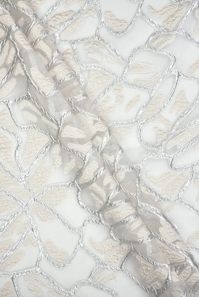 Tkanina poliestrowa typu organza z żakardowym motywem w kolorze srebrnym oraz bardzo jasnym, zimnym beżowym. Średniej wielkości wzory są gęsto i nieregularnie ułożone oraz wypukłe, a organza wykończona jest delikatną srebrną nitką. Tkanina jest transparentna, cienka, nieelastyczna, lekko sztywno się układa oraz pięknie błyszczy. Wspaniała propozycja na wieczorowe suknie, spódnice lub bluzki.