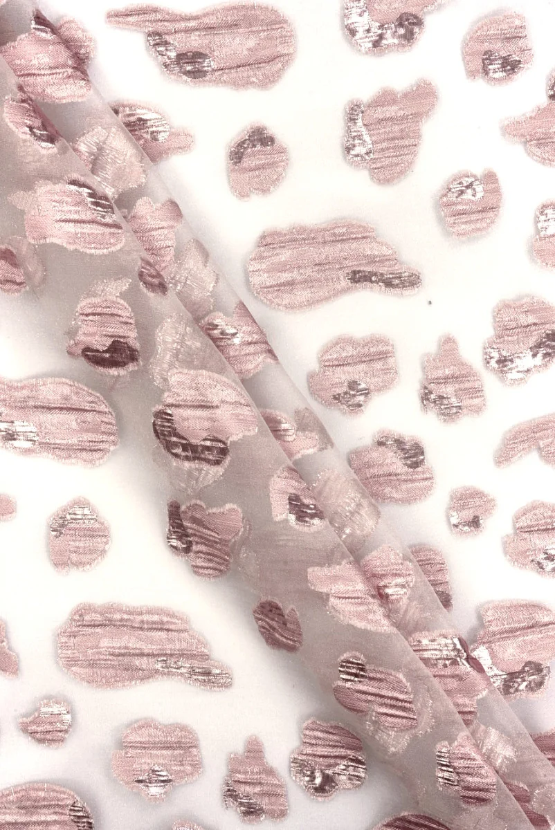 Tkanina poliestrowa typu organza z żakardowym motywem plamek w kolorze różowym. Wzory o różnych wielkościach są gęsto i nieregularnie ułożone oraz lekko wypukłe, a organza jest bogato wykończona delikatną srebrną nitką. Największa plamka ma 5 cm * 10 cm, a najmniejsza 2 cm * 2,5 cm. Tkanina jest transparentna, cienka, nieelastyczna, lekko sztywno się układa oraz pięknie błyszczy. Wspaniała propozycja na wieczorowe suknie, spódnice lub bluzki.