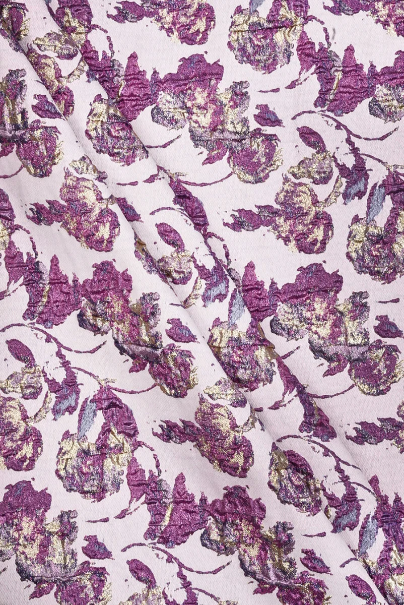 Tkanina żakardowa z motywem przypominającym w kształcie kwiaty w kolorze fioletowym i złotym na różowym, matowym tle. Gęsty i wypukły wzór, gdzie pojedynczy element ma wielkość około 7 cm * 8 cm oraz wykonany jest z błyszczących nitek. Tkanina jest dość cienka ale kryjąca, nieelastyczna, miękka w chwycie i układa się lekko sztywno. Romantyczna propozycja z której można stworzyć sukienki, spódnice, żakiety, kamizelki.