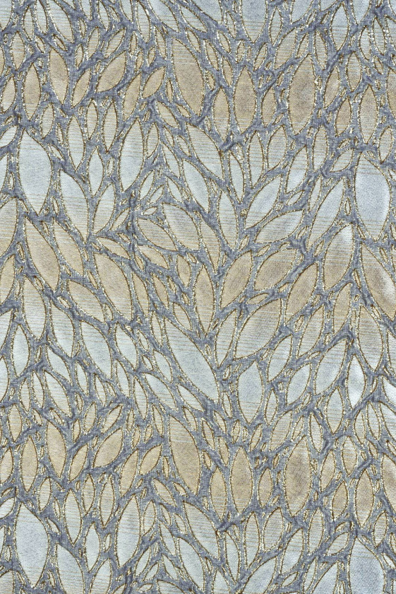 Tkanina poliestrowa żakardowa z motywem przypominającym kształtem liście w jasno szarych obwódkach. Bardzo gęsto położone motywy mają różne wielkości, najmniejszy ma 5 mm, a największy 5 cm, wypełnione są błyszczącą nitką w dwóch odcieniach beżu. Beż cieplejszy i zimniejszy utkany jest naprzemiennie co 4 cm, tworząc pasy, które dają ciekawy efekt cieniowania. Szare obwódki natomiast są wypukłe. Tkanina jest lekka, nieelastyczna, średniej grubości oraz układa się raczej sztywno. Można z niej stworzyć kreację wieczorowe, takie jak suknie, spódnice, żakiety.