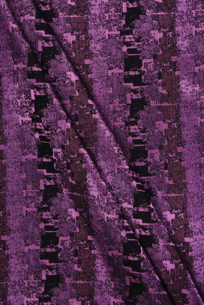 Tkanina żakardowa z motywami geometrycznymi w kolorach fioletu i czerni. Średniej wielkości wzory są gęsto, regularnie położone i układają się w linie. Największy element ma rozmiar 2 cm * 2 cm. Całość pięknie połyskuje, co nadaje tkaninie wyjątkowego wyglądu. Jest cienka, ale kryjąca, gładka i miękka w chwycie, nieelastyczna i lekka. Wspaniale sprawdzi się w uszyciu kostiumu, sukienki, spódnicy, żakietu, a nawet spodni.