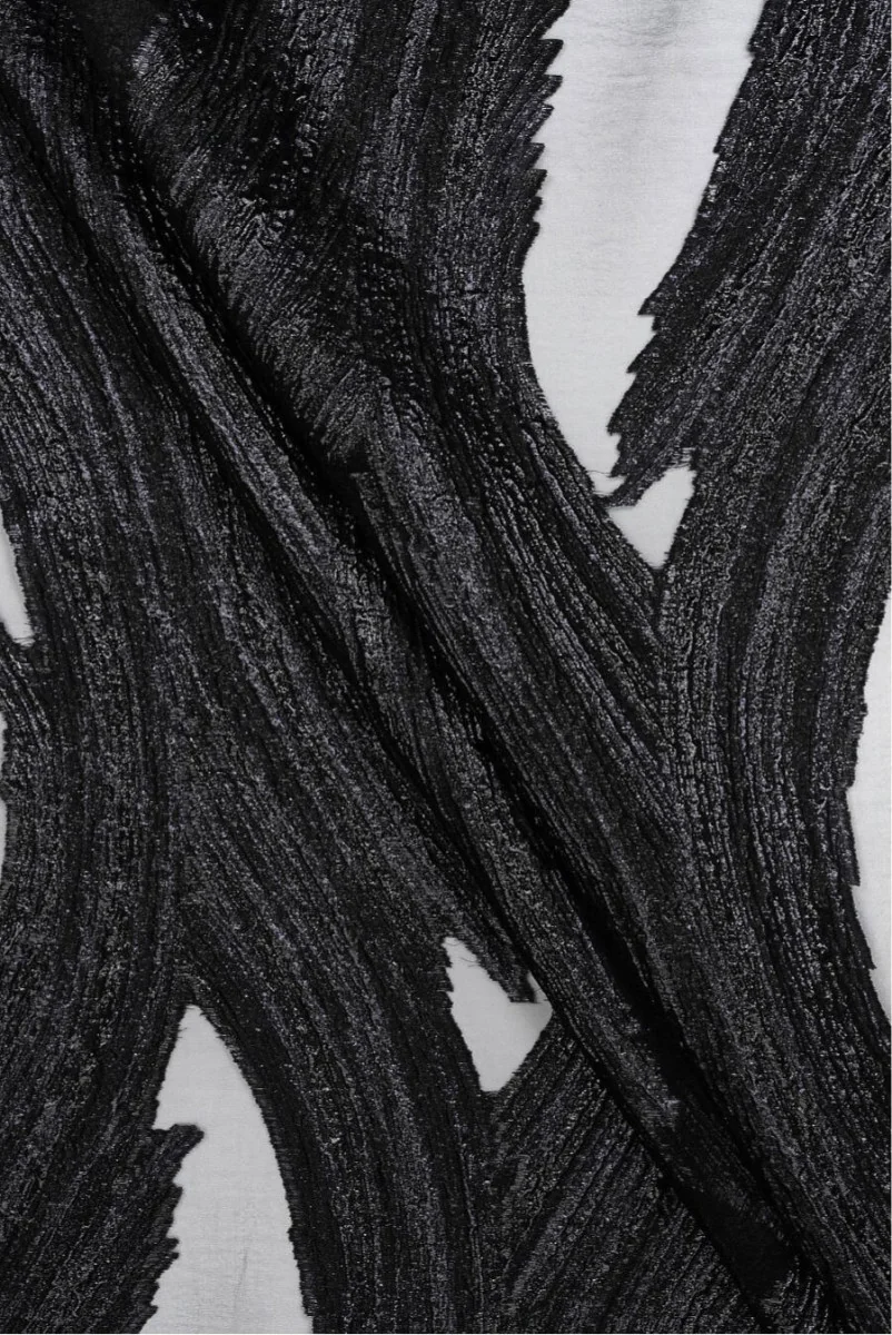 Tkanina poliestrowa typu organza z żakardowym motywem przedstawiającym duże fale w czarnym kolorze. Delikatnie wypukły, gęsty wzór jest wykonany z lekko błyszczącej czarnej nitki i mocno błyszczącej bardzo ciemno grafitowej, a całość wykonana jest na błyszczącej, czarnej organzie. Przestrzenie pomiędzy wzorem są transparentne. Tkanina jest cienka, nieelastyczna oraz układa się lekko sztywno. Piękna propozycja, którą polecamy na wieczorowe kreacje. Można z niej stworzyć suknie i spódnice.