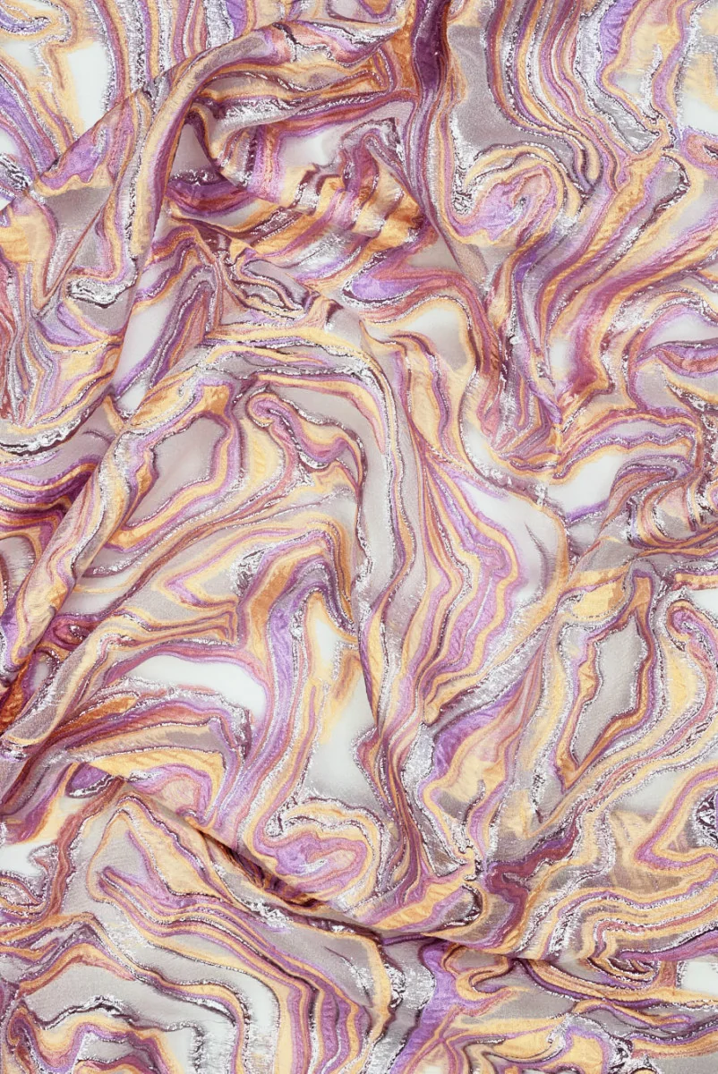 Tkanina poliestrowa typu organza z żakardowym motywem pomarańczowych oraz fioletowych fal. Delikatnie wypukły wzór jest wzbogacony falami z srebrnej, błyszczącej nitki a całość utkana jest na błyszczącej organzie w kolorze śmietankowym. Tkanina jest transparentna, nieelastyczna, cienka oraz układa się lekko sztywno. Kolorowa propozycja, która idealnie sprawdzi się na wyjściowe sukienki i spódnice, a także ciekawe okrycia wierzchnie.