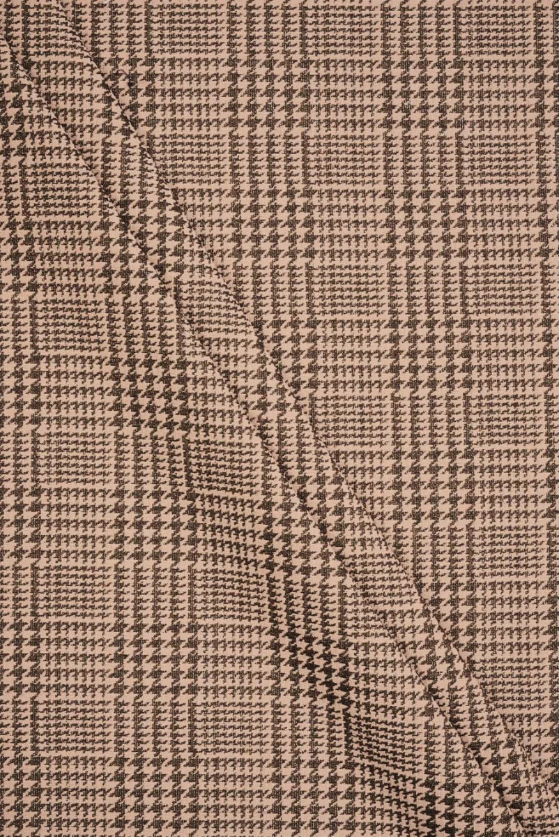 Tkanina żakardowa z motywem kraty w kolorze ciepłego beżu. Brązowe wzory kurzej stopki w różnych rozmiarach tworzą kwadraty o wielkości 5 cm * 5 cm największy i 4 cm * 4 cm mniejszy. Całość zdobiona jest błyszczącą, złotą nitką, która pięknie się mieni. Tkanina jest średniej grubości, nieelastyczna, kryjąca i układa się delikatnie sztywno. Wyjątkowa propozycja z której można uszyć marynarkę, spódnicę, spodnie lub szorty.