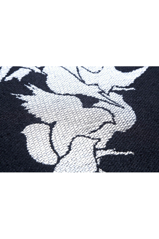 Włoska tkanina żakardowa w kuponie o wymiarach 65cm x 65cm. Bardzo ciekawy wzór srebrnych jaskółek, które tworzą znak zapytania. Wszystko wyszyte jest na czarnym tle i daje bardzo oryginalny efekt. Tkanina może posłużyć jako oryginalny detal w połączeniu z innym materiałem np. jako "przód" bluzy lub "plecy" w kurtce. Świetnie sprawdzi się także jako dekoracja np. poduszki.