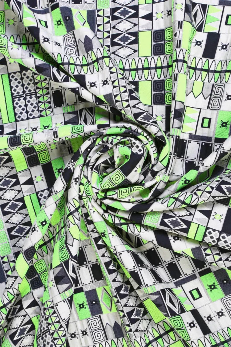 Żakard we wzór geometryczny jest tkaniną nieelastyczna z przeznaczeniem na sukienki lub kostiumy. Elementy zielone mają bardzo intensywną barwę. Można również uszyć cienki płaszczyk.