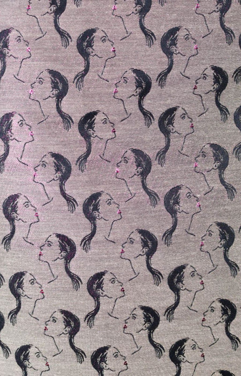 Włoska tkanina kostiumowa typu żakard. Tkanina ma bardzo oryginalny kolor tła, gdyż wątek jest wykonany z dwóch kolorów nitek: beżowej oraz błyszczącej, amarantowej. Natomiast osnowa jest w kolorze czarnym. To połączenie sprawia, że materiał pięknie się mieni w zależności od kąta padania światła. Wzór tworzą liczne twarze kobiety w kolorze czarnym z różowymi, błyszczącymi ustami. Twarze o wielkości 4cm, naprzemiennie są zwrócone raz w prawą a raz w lewą stronę.