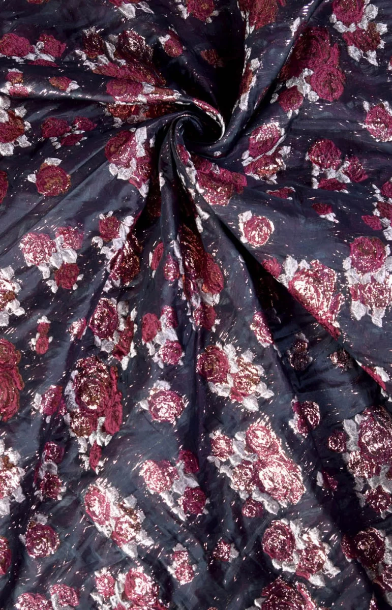 Włoska tkanina kostiumowa typu żakard. Tkanina wykonana jest z dwóch warstw. Spodniej w kolorze bardzo brudnego różu oraz wierzchniej z cienkiej, transparentnej organzy w kolorze czarnym. Nałożenie na siebie tych dwóch tkanin daję bardzo ciekawy efekt dwutonu i sprawia, że jest ona lekko wypukła ale za to bardzo lekka. Całość zdobi bogaty wzór kwiatowy złożony z większych bukiecików oraz drobniejszych, pojedynczych kwiatków. Motyw kwiatowy wykonano w kolorze bordowym z różowymi listkami z błyszczącą nitką w kolorze miedzianym. Jest to bardzo oryginalna tkanina z której można wykonać przepiękną sukienkę lub obfitą spódnicę.