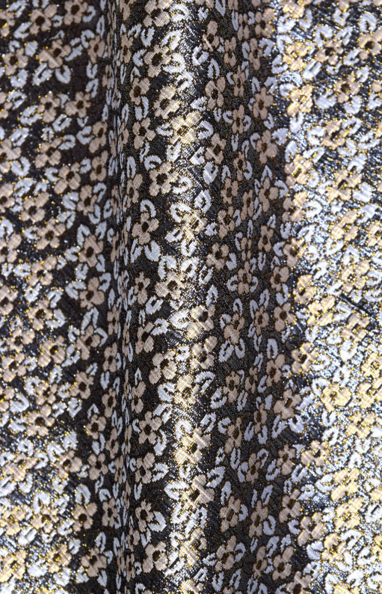 Piękny żakard w bardzo gęsty wzór małych kwiatków. Tkanina nieelastyczna, lekko sztywna, z połyskiem. Idealna na żakiety, sukienki, spódnice oraz cienkie płaszczyki.